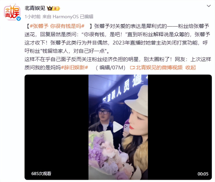 张馨予对关爱的抒发是淘气式的——粉丝给张馨予送花,回复确实是驳斥:“你很有钱,是吧!”直到听粉丝领悟说是众筹的,张馨予这才收下!张馨予此类行径并非无意,2023年直播时她曾主动关闭打赏功能,命令粉丝“钱留给家东说念主,对我方好少量”。