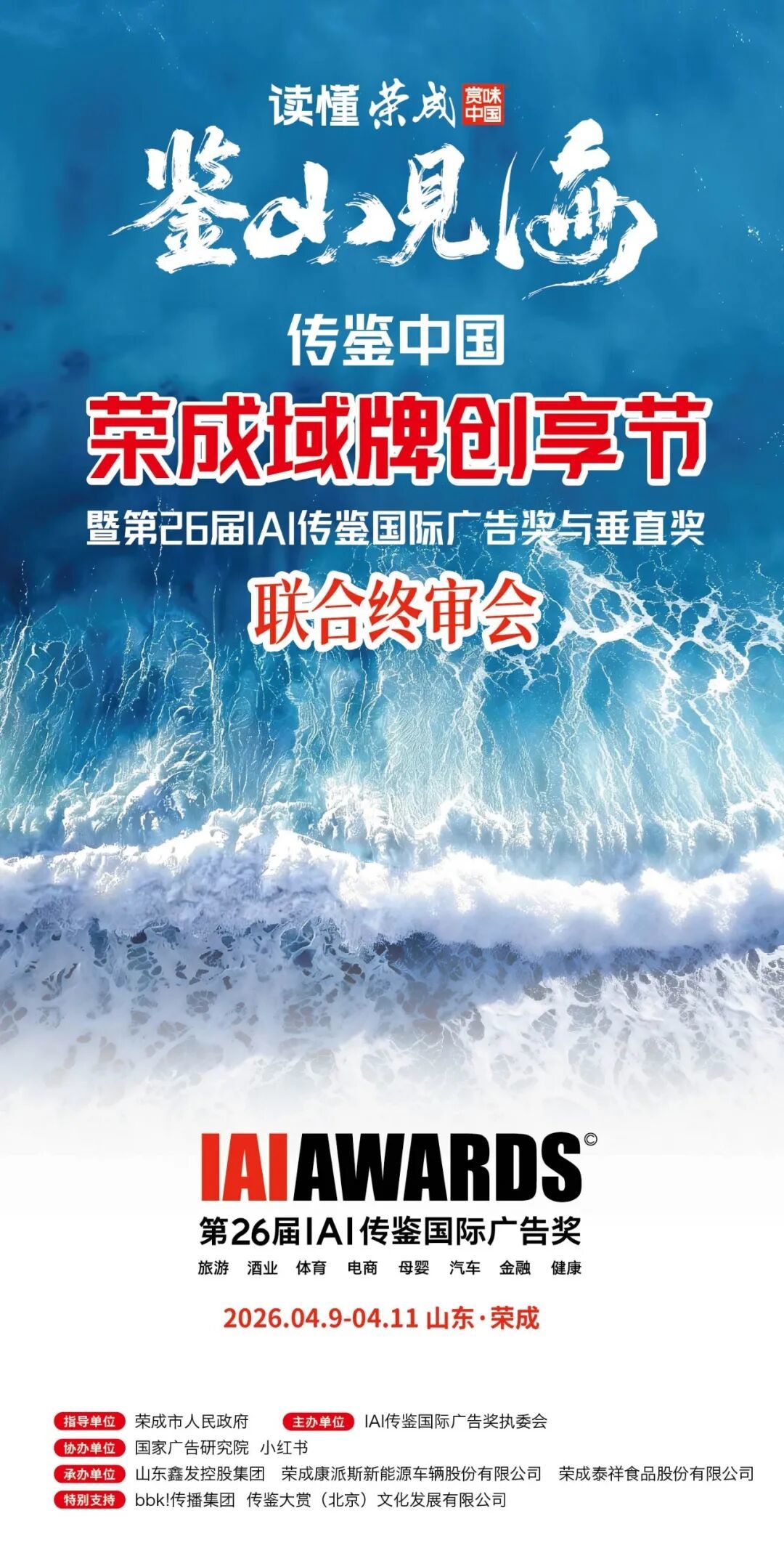 2026年4月9日至11日,清秀的海滨城市山东荣成,将迎来一场积累创意力量与产业机灵的迫切嘉会——“传鉴中国·荣成域牌创享节暨第26届IAI传鉴国外告白奖终审会”。行为由荣成市东谈主民政府领导,IAI传鉴国外告白奖执委会专揽,国度告白谈论院、小红书协办,山东鑫发控股集团、荣成康派斯新动力车辆股份有限公司、荣成泰祥食物股份有限公司经办,bbk!传播集团与传鉴大赏(北京)文化发展有限公司十分支抓,共同打造一场会通创意评审、产业通常与城市品牌传播的行业嘉会。